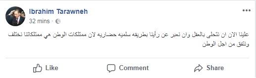 ووجه الطراونة نداء الى ابناء الوطن عبر صفحته الشخصية في موقع الفيس بوك بالقول "علينا الان ان نتحلى بالعقل وان نعبر عن رأينا بطريقه سلميه حضاريه لان ممتلكات الوطن هي ممتلكاتنا نختلف ونتفق من اجل الوطن".