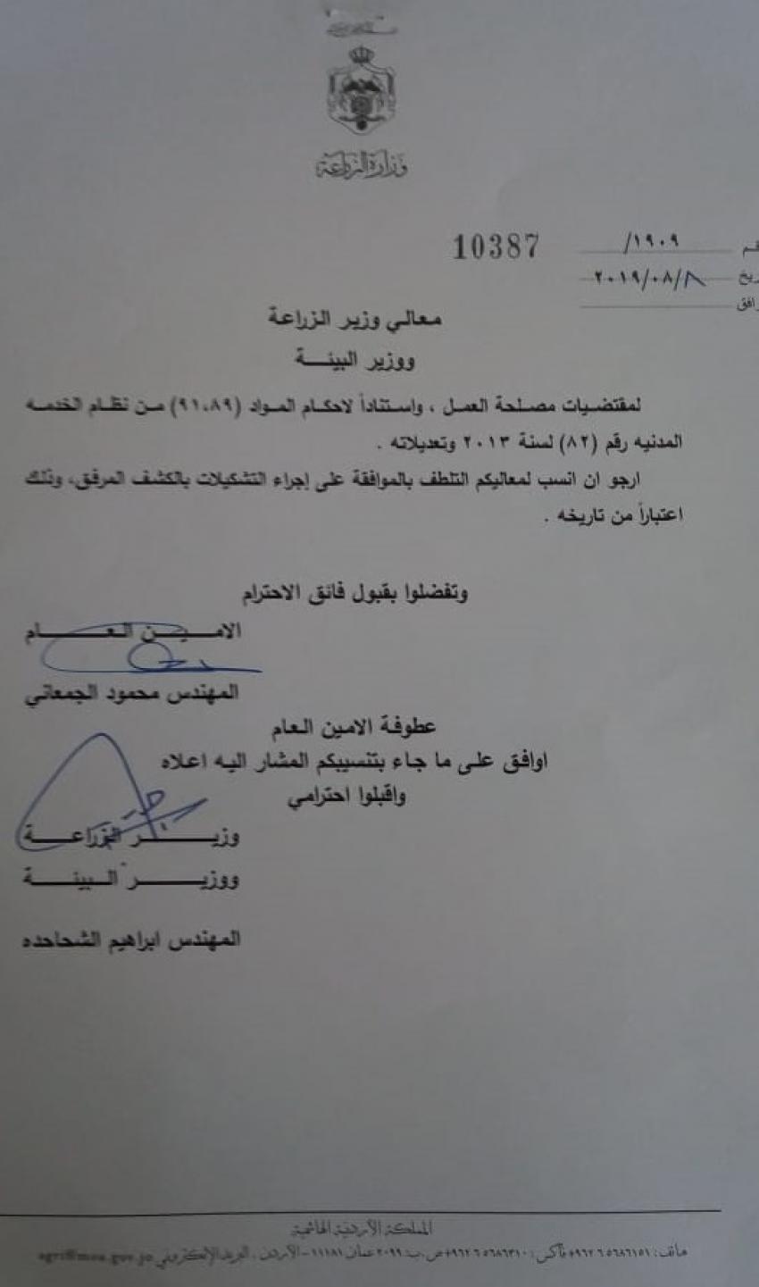 قرر وزير الزراعة ووزير البيئة المهندس ابراهيم الشحاحدة وبناء على تنسيب الامين العام اجراء تشكيلات ادارية اعتبار من تاريخ 8/8/2019.