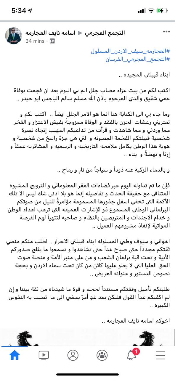 النائب العجارمة يطلب من انصاره إمهاله : "ستسمعوني من تحت القبة"