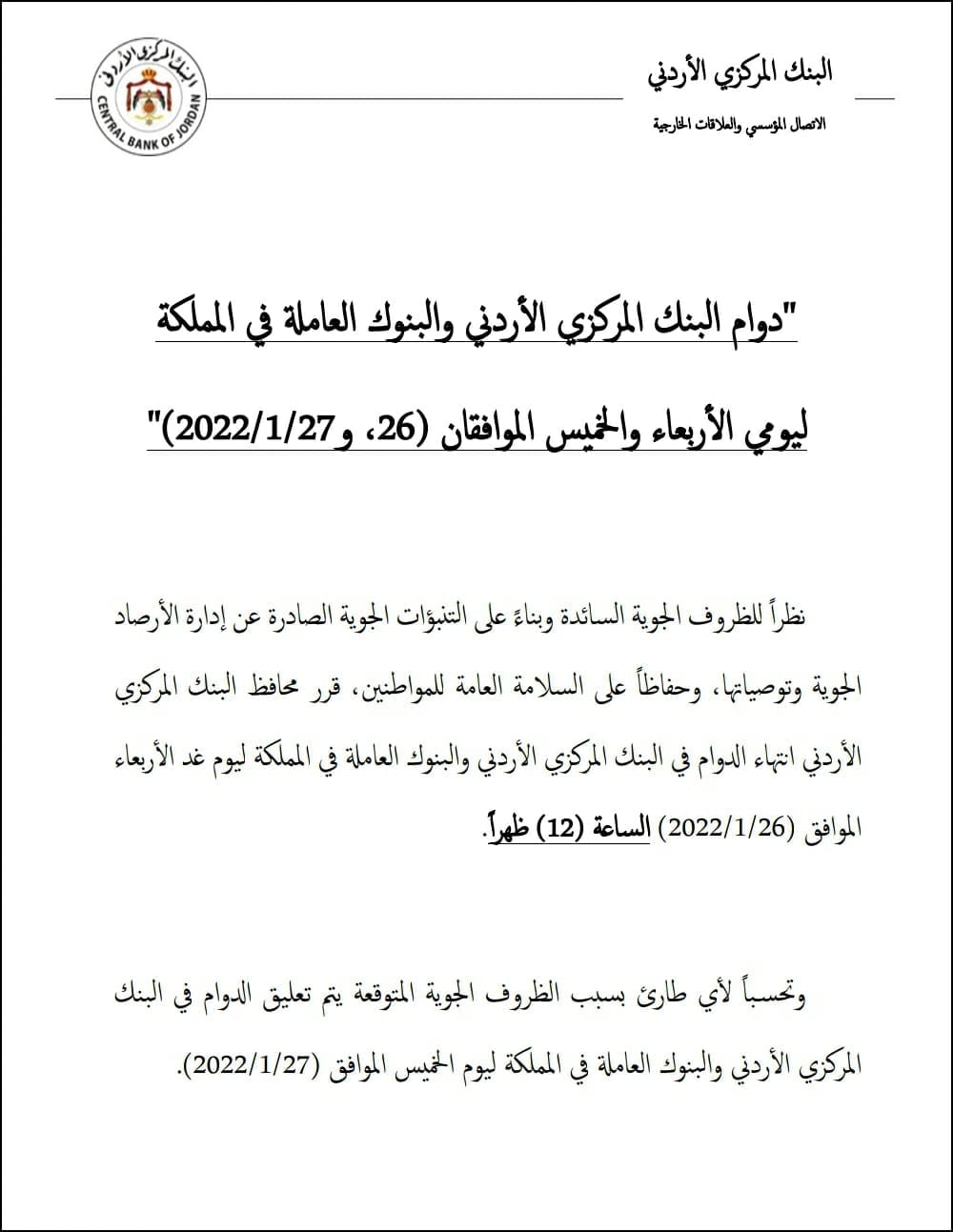 أعلن البنك المركزي الأردني اليوم الثلاثاء، دوام والبنوك العاملة في المملكة ليومي الأربعاء والخميس.