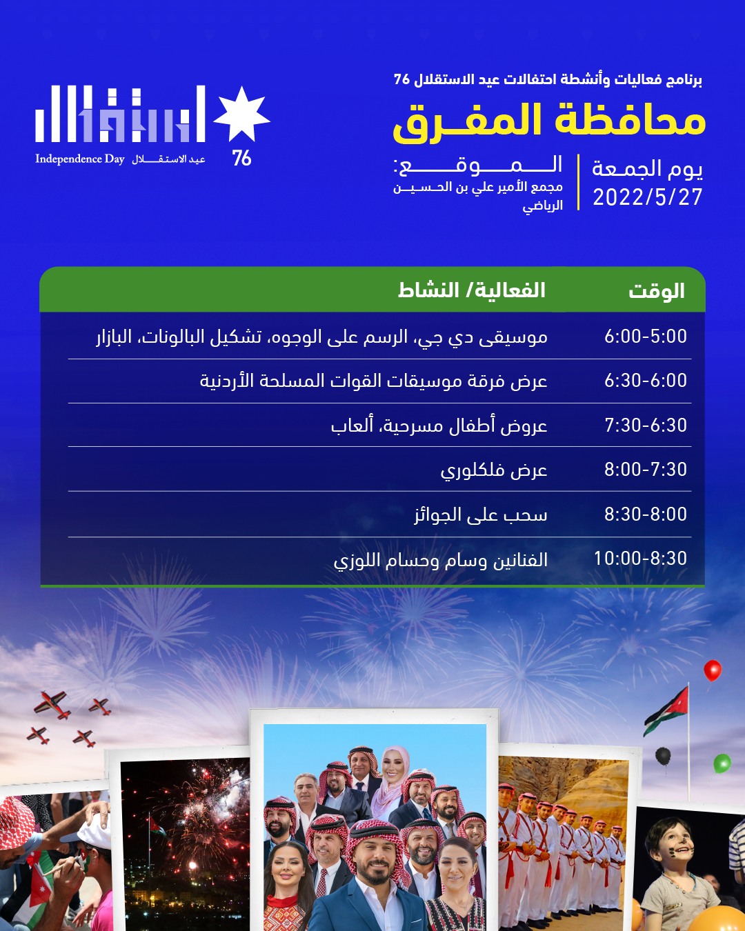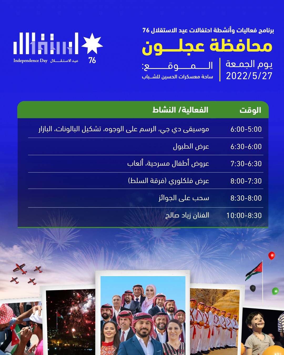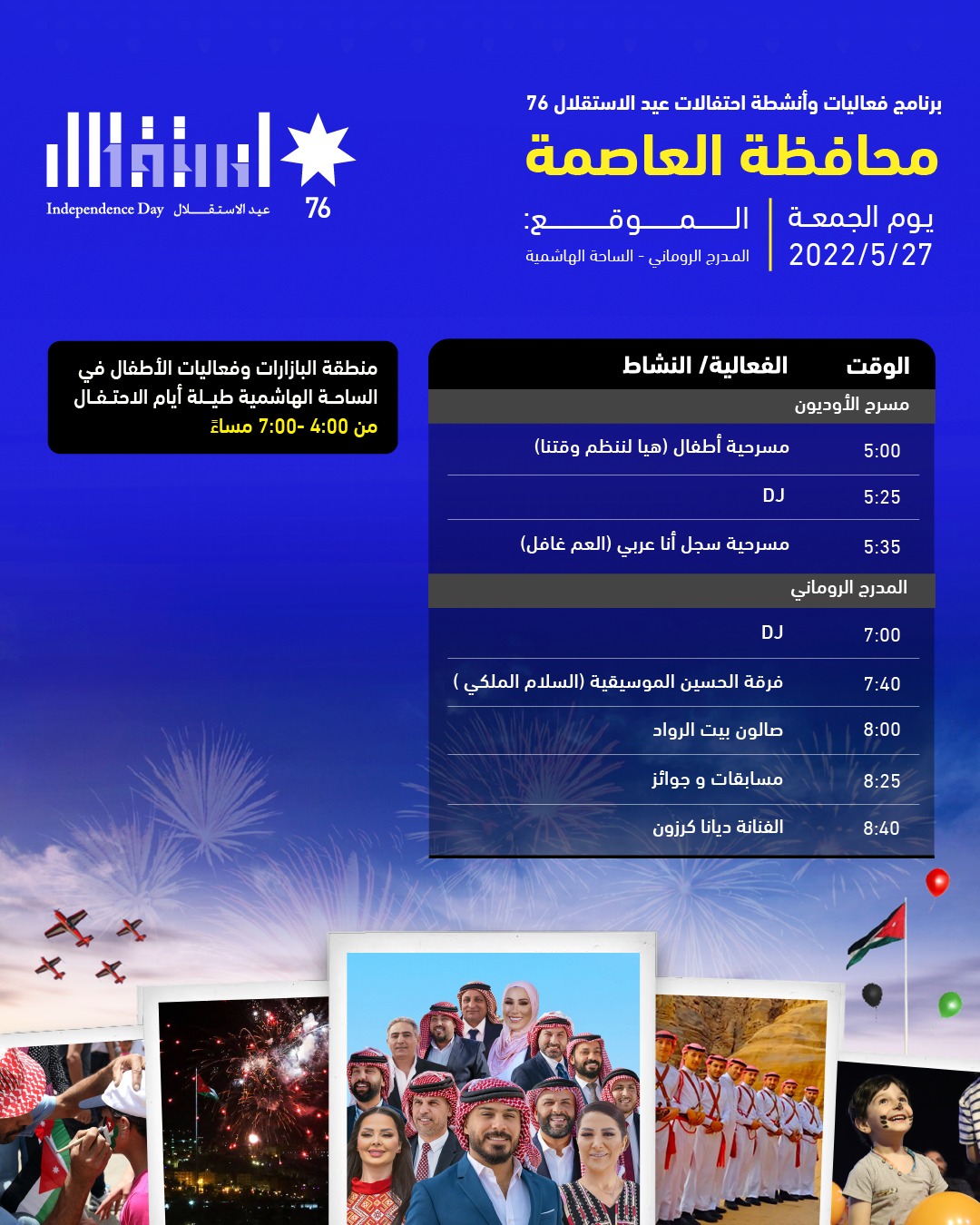 تتواصل فعاليات الاحتفال بعيد استقلال المملكة الأردنية الهاشمية الـ76، لليوم الثالث على التوالي، في جميع محافظات المملكة.