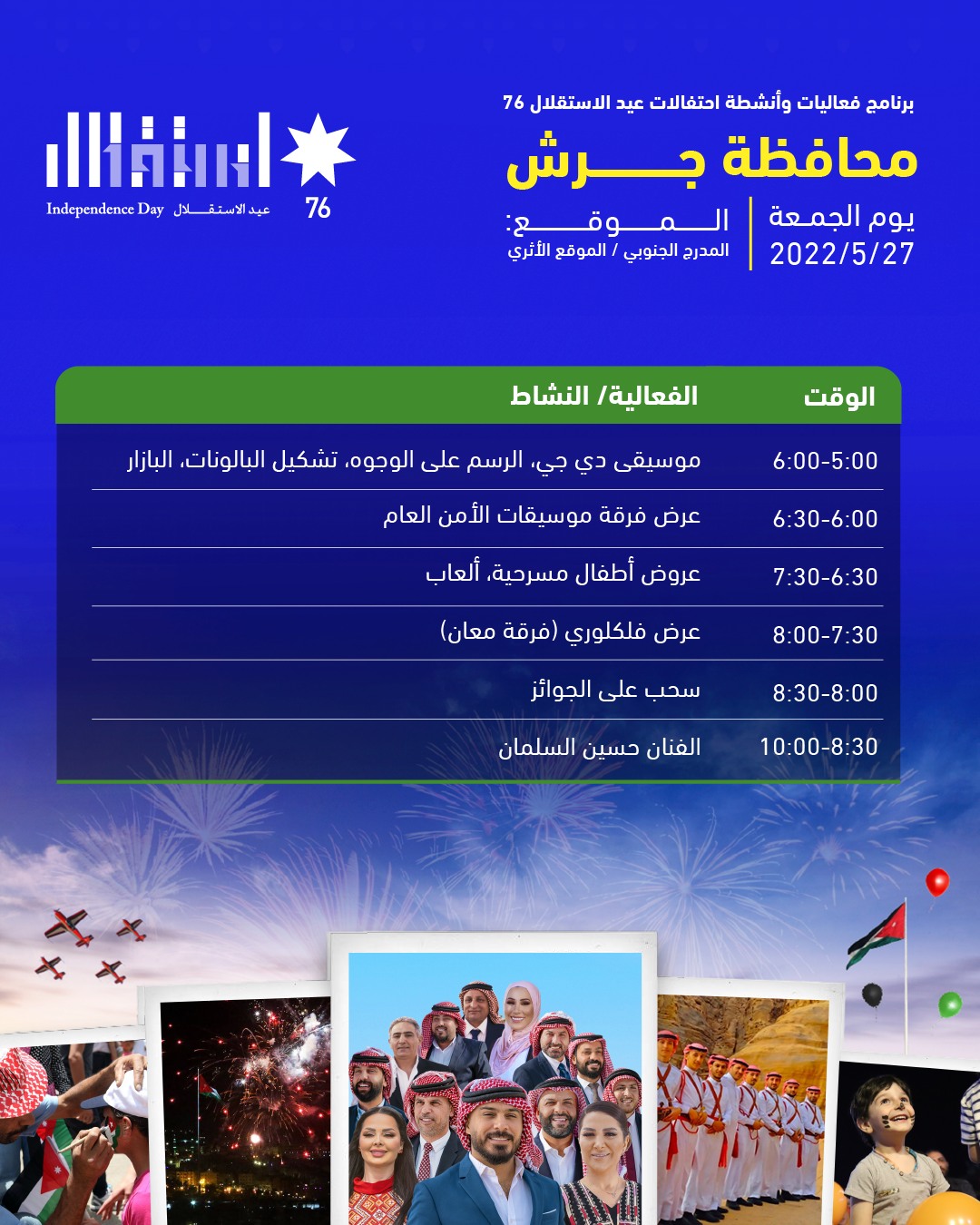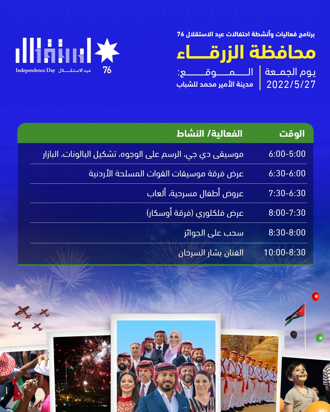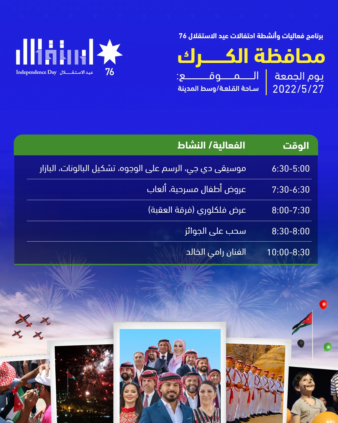 تتواصل فعاليات الاحتفال بعيد استقلال المملكة الأردنية الهاشمية الـ76، لليوم الثالث على التوالي، في جميع محافظات المملكة.
