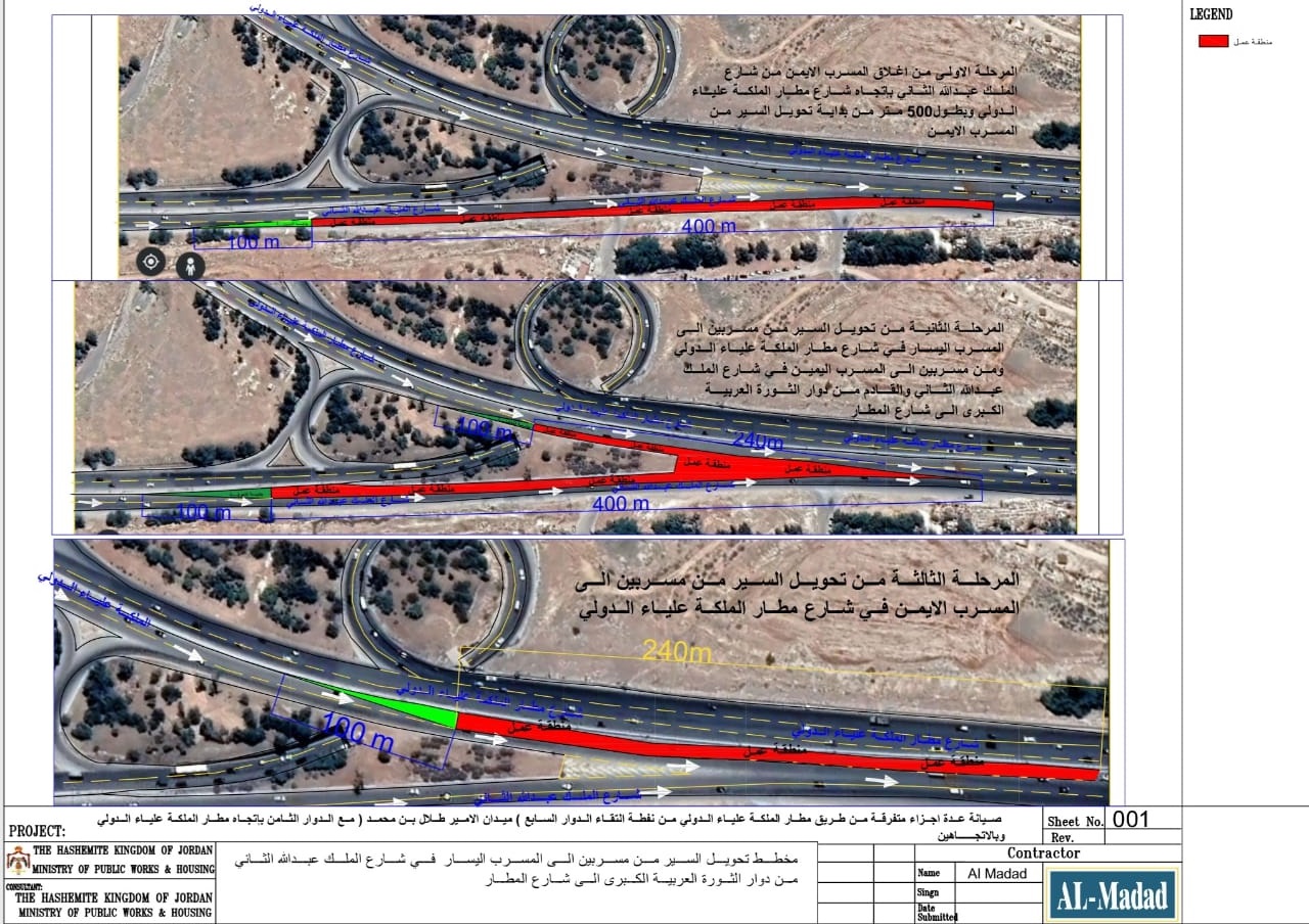 ١- المرحلة الاولى: تتضمن اغلاق المسرب الايمن من شارع الملك عبدالله الثاني وتحويل حركة السير إلى المسرب الايسر للاتجاه القادم من شارع الملك عبد الله الثاني باتجاه طريق المطار ولمسافة ٥٠٠ متر