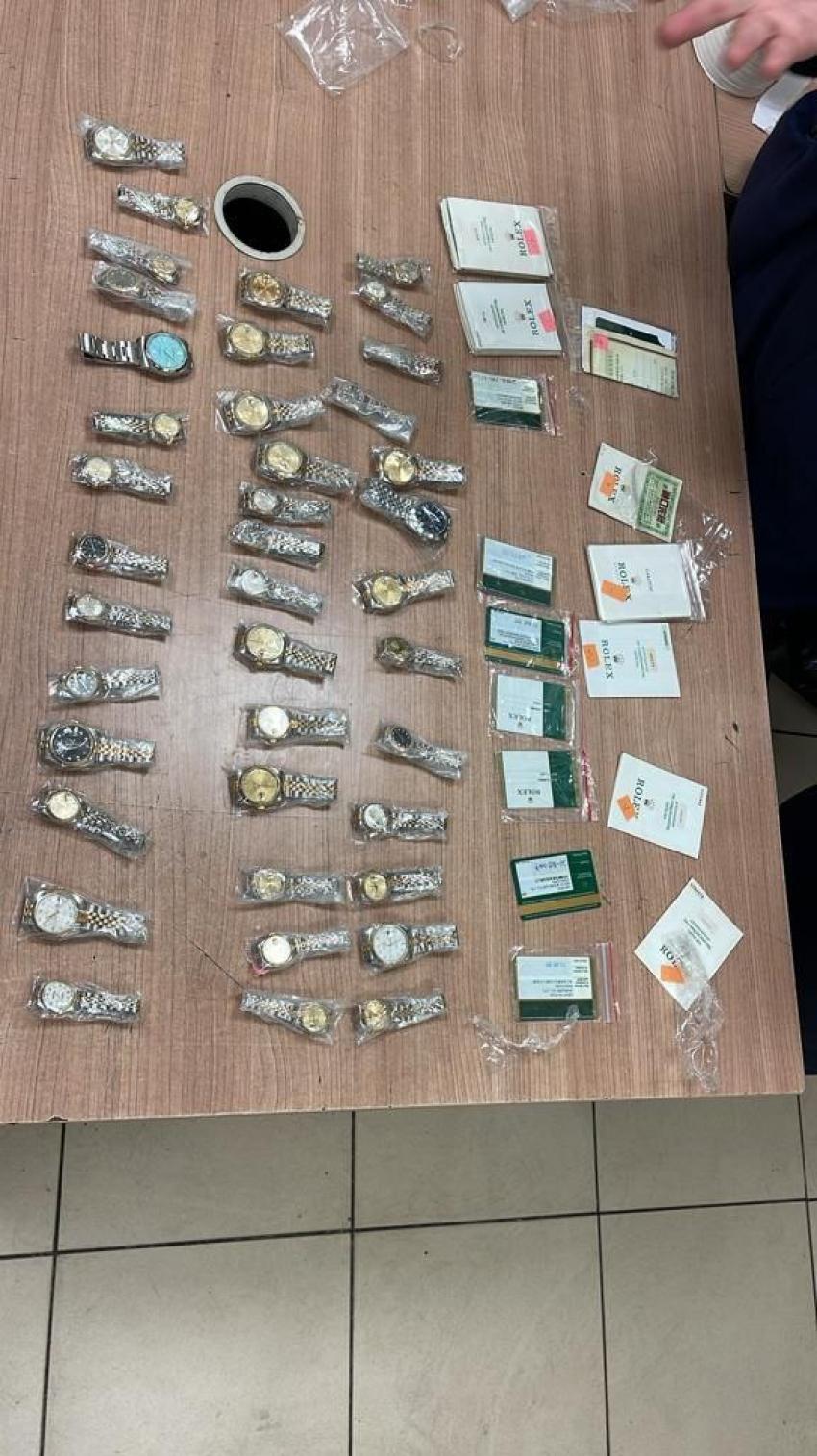 وأشارت إلى أن التفتيش اسفر عن ضبط ٤٠ ساعة رولكس اخفاهم الراكب حول ساقيه اسفل الجورب وفي أماكن أخرى على جسده.