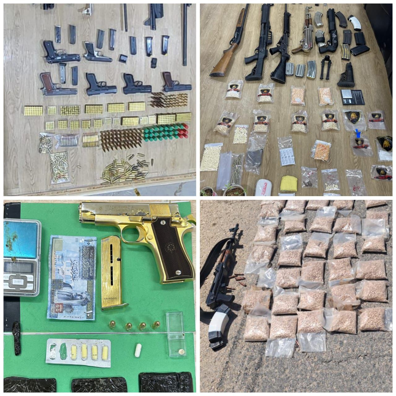 وفي جنوب العاصمة وبعد جمع المعلومات حول أحد الأشخاص المشبوهين بقضايا الاتجار بالأسلحة النارية والتأكد من حيازته وعرضه لكمية من الأسلحة النارية للبيع جرت مداهمته وإلقاء القبض عليه وضبط داخل منزله ٨ أسلحة نارية متنوعة من بينها أسلحة أوتوماتيكية.