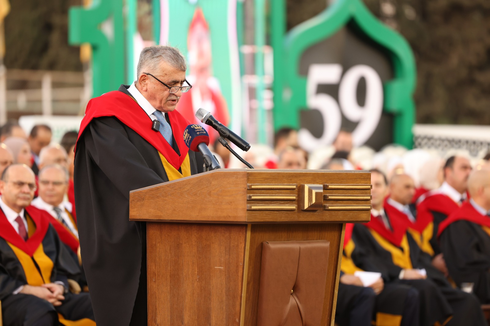 وقال رئيس الجامعة الأردنية الدكتور نذير عبيدات، في مستهل كلمته، إنّه بات لاسم الجامعة الأردنية بريق في الأعالي، وأساتذتها باتوا مرادفًا للتميّز وعنوانًا للعطاء، وخريجوها صاروا بالمجد يُعرّفون، وإليه يُنسبون.