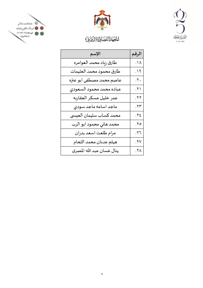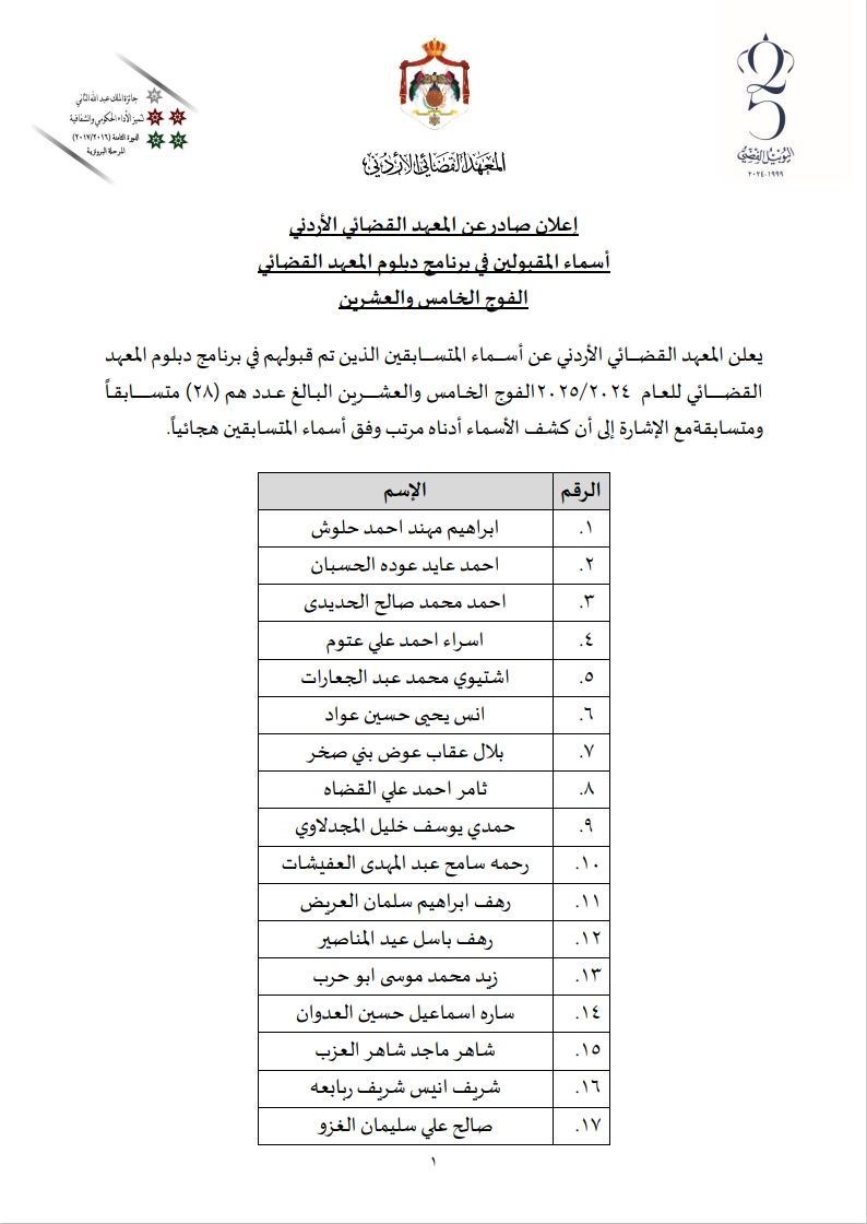 أعلن المعهد القضائي الأردني، الثلاثاء، عن أسماء المتسابقين الذين تم قبولهم في برنامج دبلوم المعهد القضائي للعام 2024/2025 الفوج الخامس والعشرين والبالغ عدد هم (28) متسابقاً ومتسابقة.