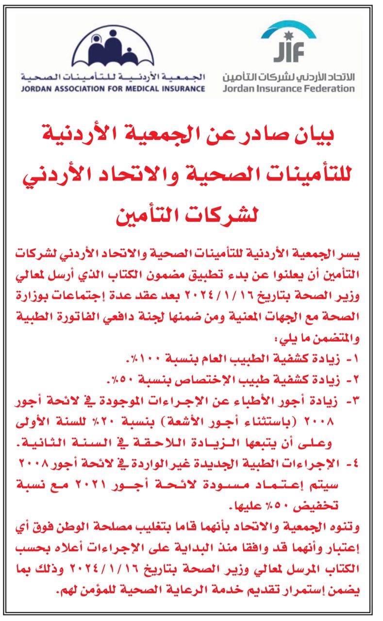 أعلن الاتحاد الأردني لشركات التأمين والجمعية الأردنية للتأمينات الصحية عن بدء تطبيق لائحة أجور طبية جديدة وفقًا الكتاب الذي أرسل لوزير الصحة بتاريخ 16/1/2024.