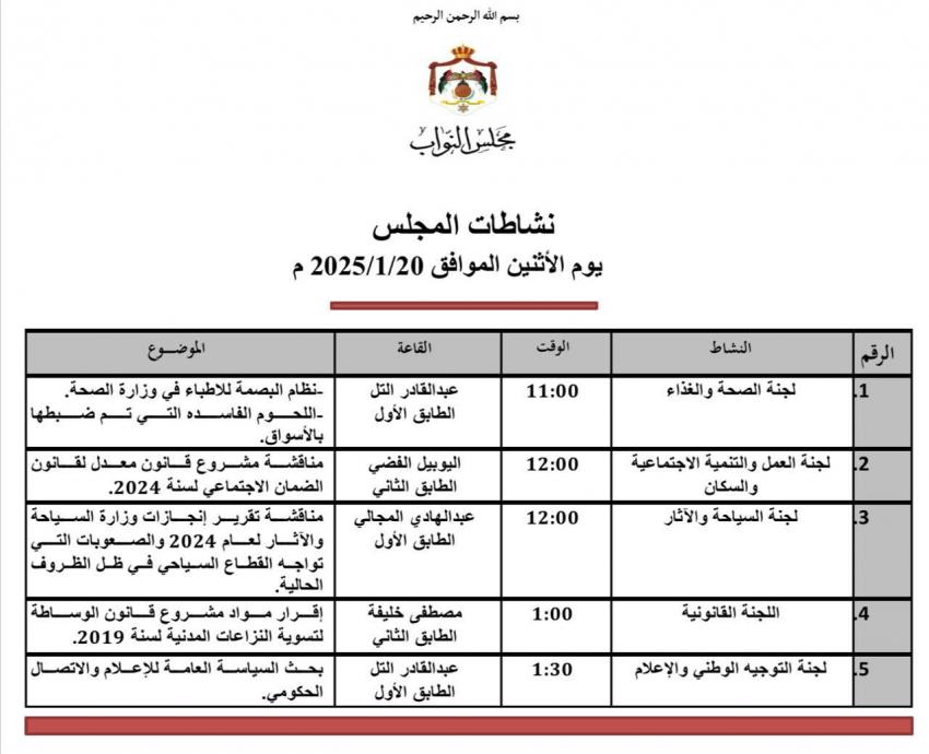 تجتمع لجان نيابية مختصة في مجلس النواب الاثنين؛ لمناقشة مشاريع قوانين أحيلت إليها من المجلس، وقضايا عدة، أبرزها مناقشة مشروع قانون معدل لقانون الضمان الاجتماعي لسنة 2024، من قبل لجنة العمل النيابية.