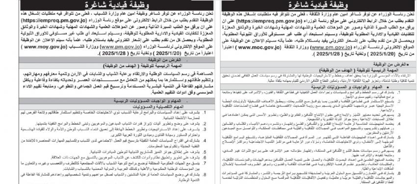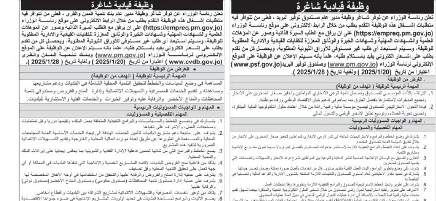 أعلنت رئاسة الوزراء اليوم الاثنين عن حاجتها لشغل العديد من الوظائف القيادية "أمين عام وزارة الثقافة ، وامين عام وزارة الشباب ، مدير عام صندوق توفير البريد، ومدير عام بنك تنمية المدن والقرى".