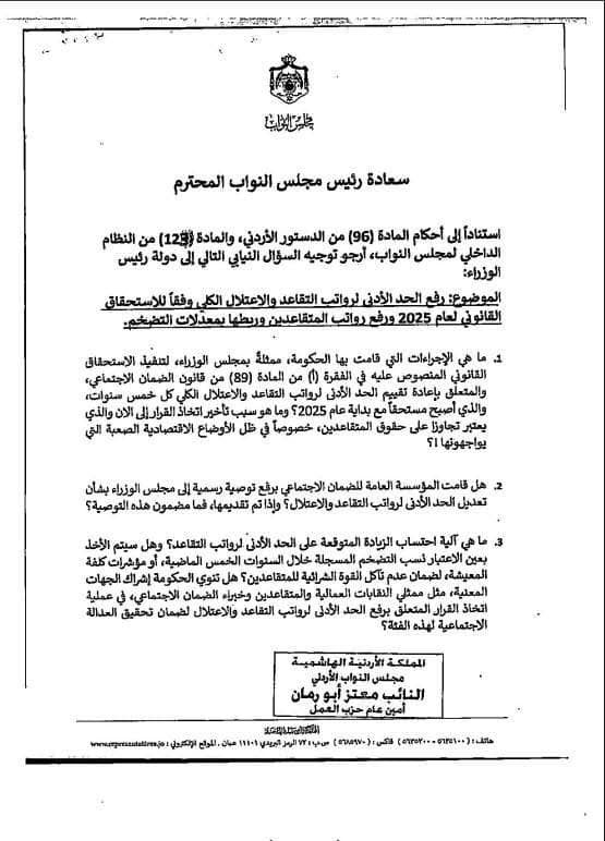 وختم الصبيحي، بصراحة فإن ردّ الوزير على السؤال النيابي زادنا قناعة بضرورة الإصرار على إنفاذ الاستحقاق القانوني برفع الحد الأدنى لراتب التقاعد، والأخذ بمقترح "الرفع" وفقاً للقيمة المذكورة أو قريباً منها على الأقل.
