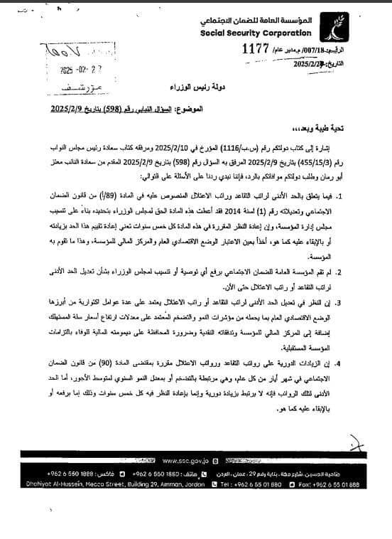 ولمناقشة رد رئيس مجلس إدارة مؤسسة الضمان، الذي يُفهَم منه بأن المؤسسة لا تفكر برفع الحد الأدنى لراتب التقاعد، أقول: