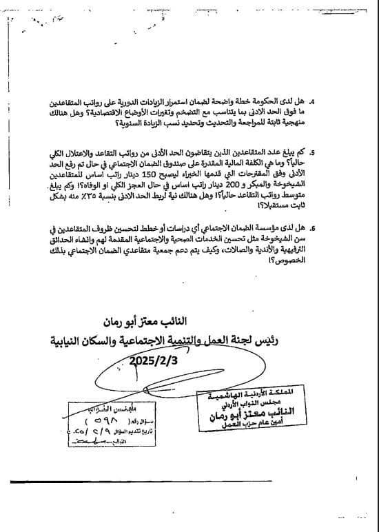ثالثاً: القول بأن مؤسسة الضمان لم تقم برفع تنسيب لمجلس الوزراء بشأن تعديل الحد الأدنى لراتب التقاعد وراتب الاعتلال، القول بهذا على لسان رئيس مجلس إدارة المؤسسة مُستهجَن، لأن مجلس الإدارة هو المسؤول وهو صاحب الصلاحية بالتنسيب لمجلس الوزراء بهذا الموضوع، فلماذا لم يتحدث رئيس المجلس عن أسباب إحجام المجلس عن التنسيب لمجلس الوزراء بتعديل الحد الأدنى، فماذا ينتظر.؟!