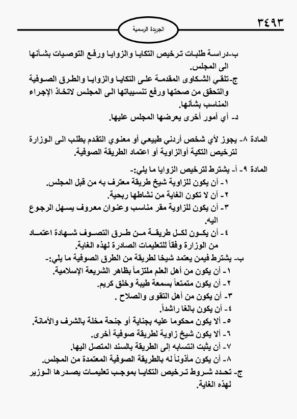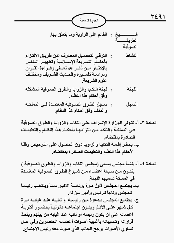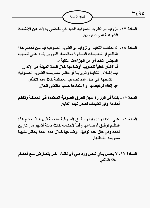ويحظر النظام عمل التكايا والزوايا غير الحاصلة على ترخيص، كما تشكل بموجبه لجنة لذلك وسجل للطرق الصوفية المعترف بها في المملكة.