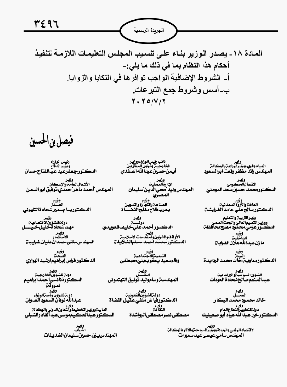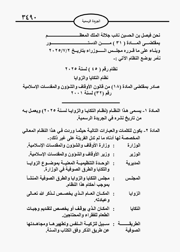 صدر في عدد الجريدة الرسمية اليوم الأربعاء، نظام التكايا والزوايا، المعني بتنظيم عمل الزوايا والطرق الصوفية المعترف بها في المملكة رسميًا.
