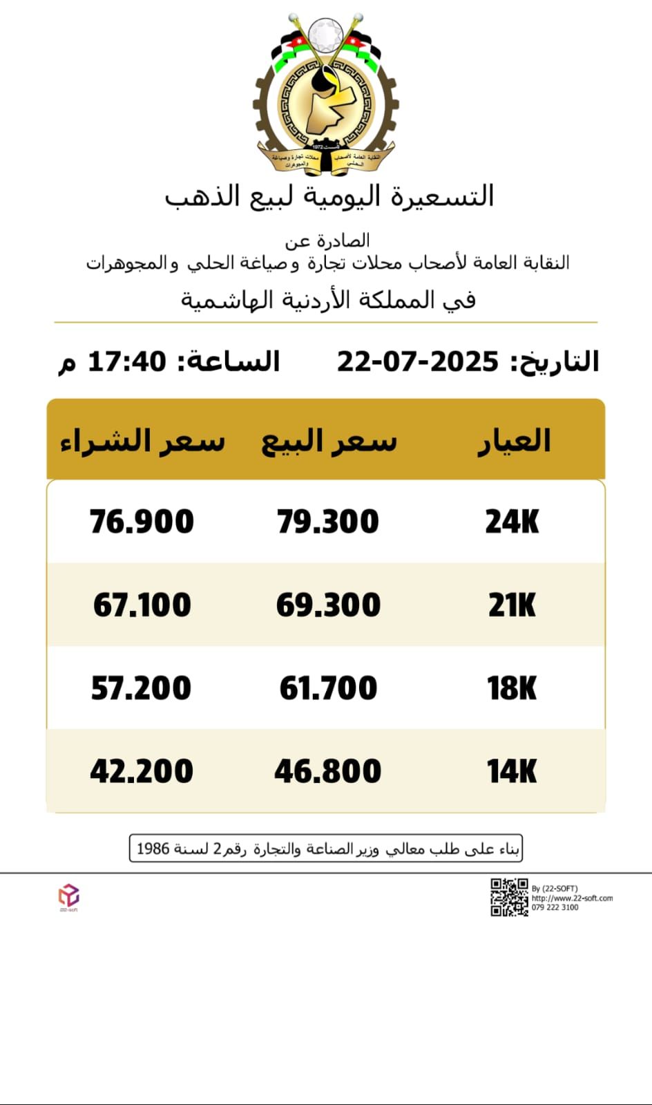 وبلغ سعر الغرام الواحد من الذهب عيارات 24 و18 و14 لغايات البيع من محلات الصاغة عند 79.3 و61.7 0 و46.80 دينارا على التوالي.