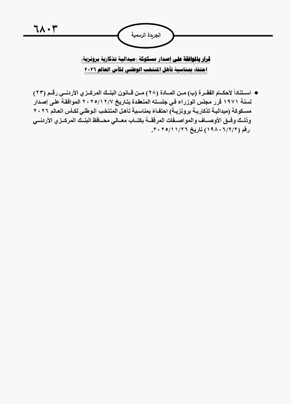 صدر في عدد الجريدة الرسمية، الثلاثاء، قرار بالموافقة على إصدار عملة تذكارية برونزية بمناسبة تأهل المنتخب الوطني لكرة القدم إلى نهائيات كأس العالم 2026.