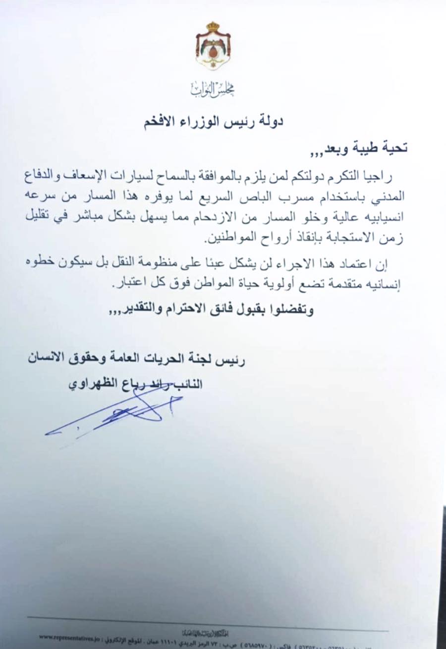 قدم رئيس لجنة الحريات العامة وحقوق الانسان النائب رائد رباع الظهراوي، طلبا الى رئيس الوزراء يطالب فيه بالسماح لسيارات الإسعاف والدفاع المدني باستخدام مسرب الباص السريع لما يوفره هذا المسار من سرعة انسيابية عالية وخلو المسار من الازدحام مما يسهل بشكل مباشر في تقليل زمن الاستجابة بإنقاذ أرواح المواطنين.