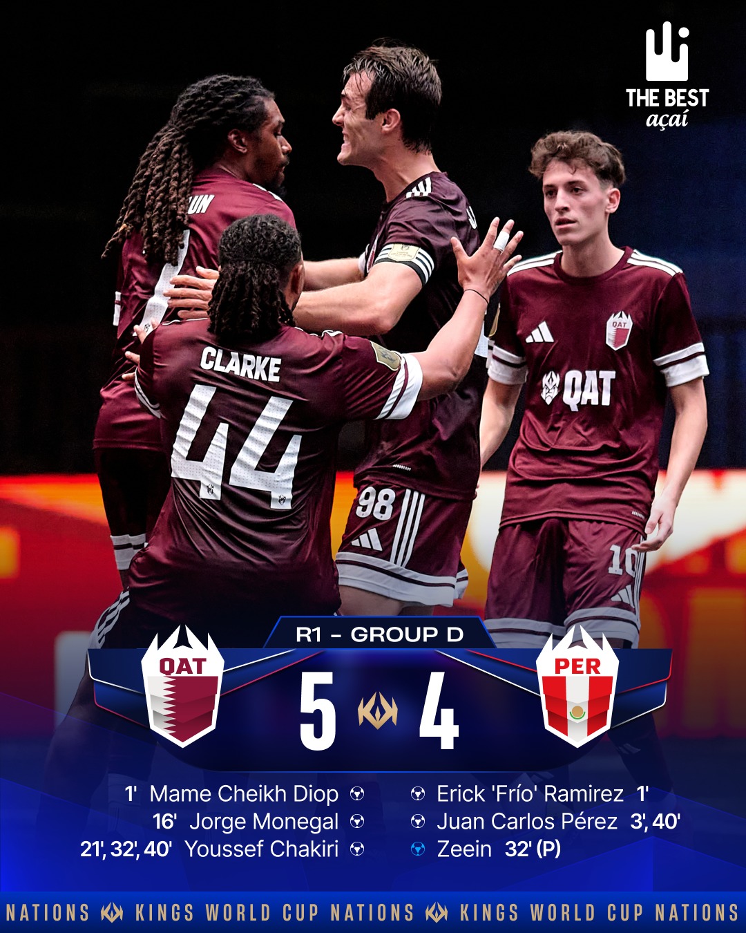 أما المنتخب القطري، فحقق فوزاً مثيراً على منتخب بيرو بنتيجة (5–4) ضمن المجموعة الرابعة، بفضل تألق يوسف شاكيري الذي أحرز ثلاثة أهداف، إلى جانب بصمة زكريا زروال الذي صنع تمريرتين حاسمتين، في مباراة حبست الأنفاس حتى صافرتها الأخيرة.
