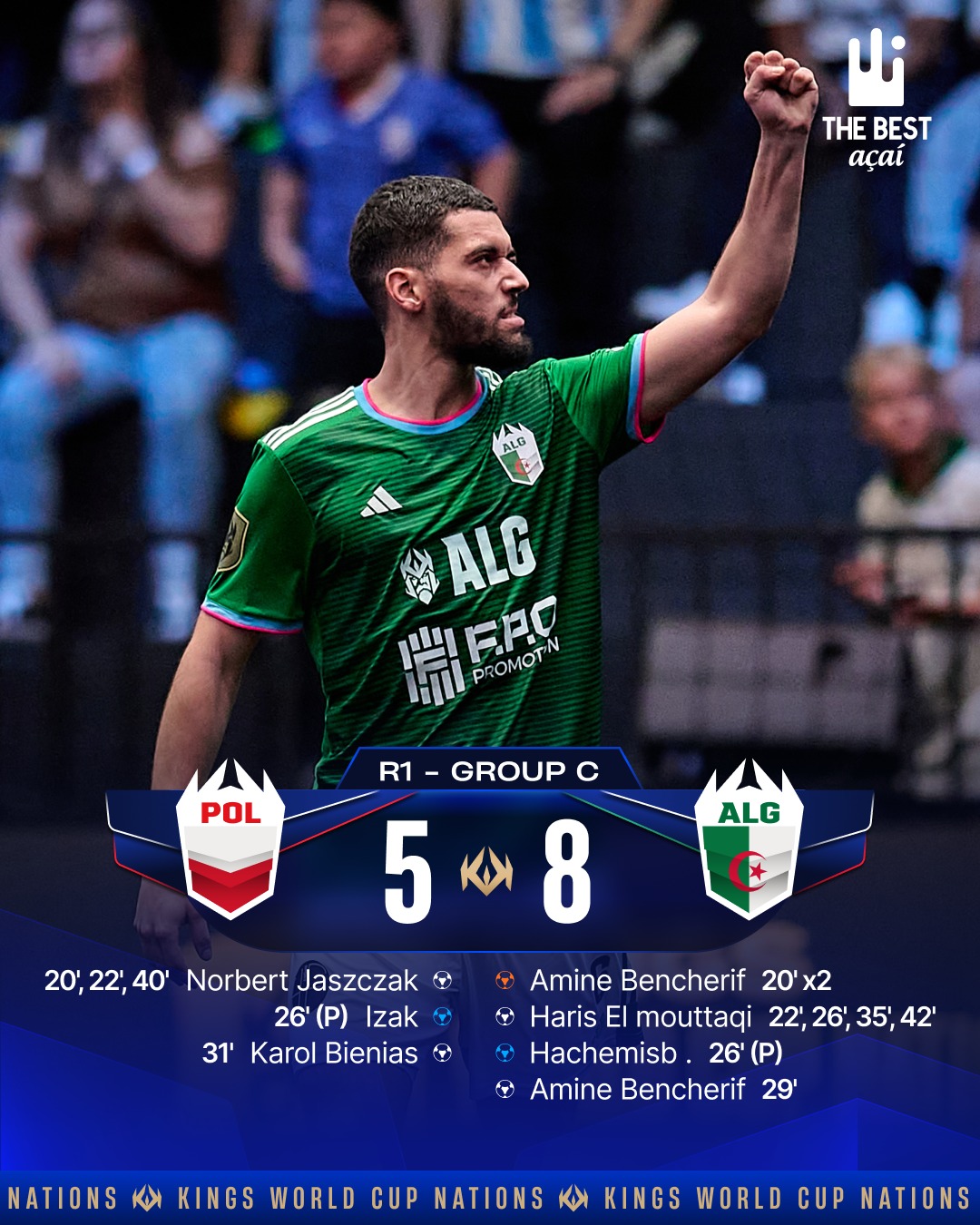 وفي المجموعة الثالثة، استهل المنتخب الجزائري مشواره بفوز قوي على منتخب بولندا بنتيجة (8–5)، في مباراة شهدت مشاركة أسماء كروية عالمية للمرة الأولى في كأس الملوك، حيث قاد النجم البولندي روبرت ليفاندوفسكي منتخب بلاده، فيما مثل الجزائر المدافع الدولي السابق كارل مجاني. وجاءت المواجهة على قدر التوقعات، غير أن الأفضلية كانت جزائرية بفضل الأداء الهجومي اللافت.