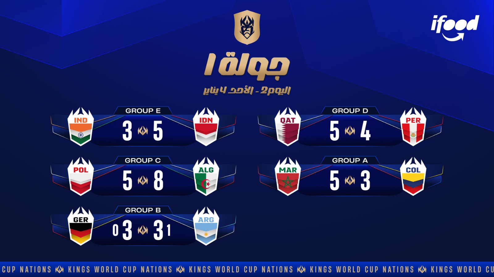 في المجموعة الأولى، قدّم المنتخب المغربي عرضاً هجومياً قوياً، بعدما تغلب على منتخب كولومبيا بنتيجة (5–3)، محققاً فوزاً ثأرياً بعد خروجه أمام المنتخب ذاته من ربع نهائي النسخة الماضية التي أُقيمت في إيطاليا.