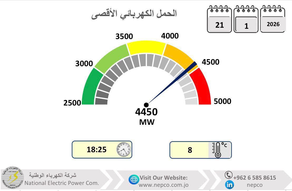 سجّل النظام الكهربائي الأردني مساء اليوم الأربعاء، أعلى مستوى حمل منذ بداية فصل الشتاء الحالي، حيث بلغ نحو 4450 ميغاواط، تزامنًا مع موجة البرد التي تشهدها مختلف مناطق المملكة.