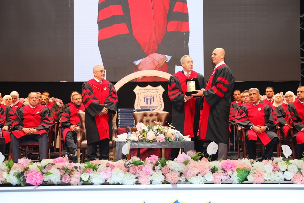 • ثم قام راعي الحفل والى جانبه رئيس الجامعة بتكريم الدكتور مراد المعايطة، تقديرًا لتميّزه في مجال البحث العلمي وإسهاماته القيمة في خدمة المسيرة الأكاديمية.