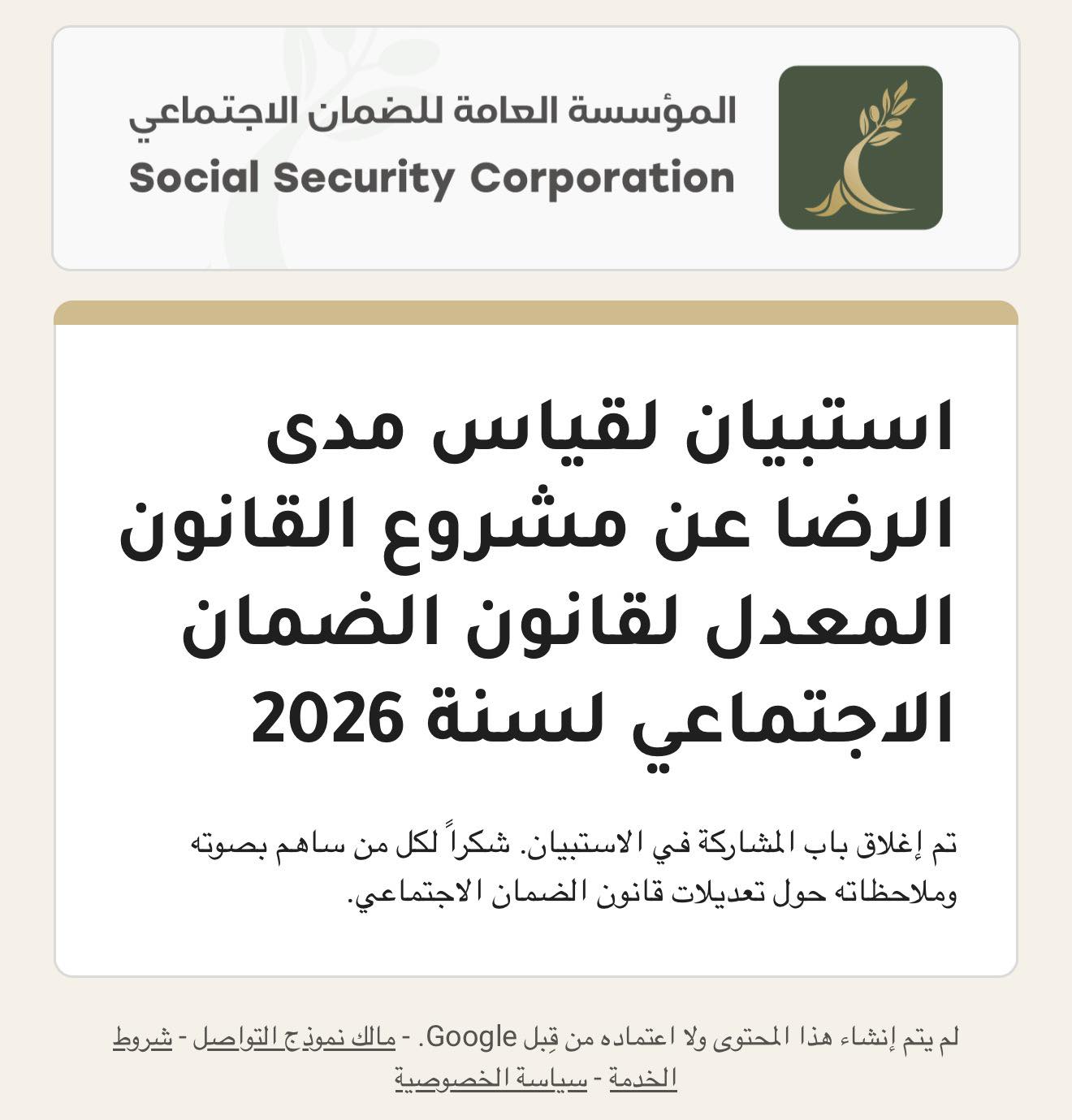 وعند الدخول إلى الاستبيان، يوجه الضمان رسالة مفادها "تم إغلاق باب المشاركة في الاستبيان. شكرًا لكل من ساهم بصوته وملاحظاته حول تعديلات قانون الضمان الاجتماعي".