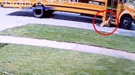 فيديو لكاميرا مراقبة يظهر طفلة بينما تجرها حافلة مدرسية في شارع بمدينة لويسفيل، كما تظهر سيارة مسرعة تحاول تجاوز الحافلة.