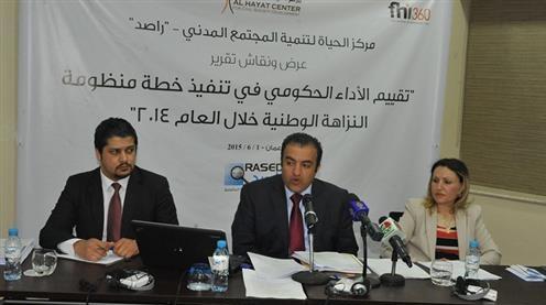 وقال مدير مركز الحياة لتنمية المجتمع المدني د. عامر بني عامر في مؤتمر صحفي اليوم لعرض نتائج تقرير "تقييم الأداء الحكومي في تنفيذ خطة منظومة النزاهة الوطنية خلال العام 2014"، إن التقرير يأتي استكمالاً للجهود التي يبذلها "راصد" في مراقبته للانتخابات وأداء البرلمان، حيث سيكون هذا التقرير باكورة تقارير دورية تصدر بانتظام لمراقبة الأداء الحكومي في قطاعات مختلفة.