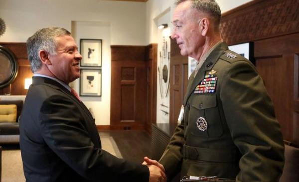 استقبل جلالة الملك عبدالله الثاني، اليوم الإثنين، رئيس هيئة الأركان المشتركة الأميركية الجنرال جوزيف دانفورد، الذي يزور الأردن ضمن جولة له في المنطقة، حيث جرى استعراض علاقات التعاون بين البلدين، خصوصا في المجالات العسكرية، إضافة إلى تطورات الأوضاع في الشرق الأوسط.