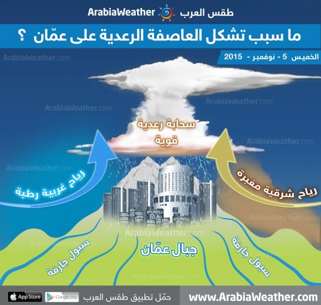 * في الاسفل صورة توضيحية من موقع طقس العرب عن أسباب تشكل السحابة الرعدية القوية على العاصمة الأردنية عمان