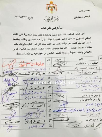 وطالب الموقعون على المذكرة التي تبناها النائب بسام البطوش الحكومة بتقديم احتجاج الى سفارة واشنطن حول تصريحات ترامب الاستفزازية ضد المسلمين.