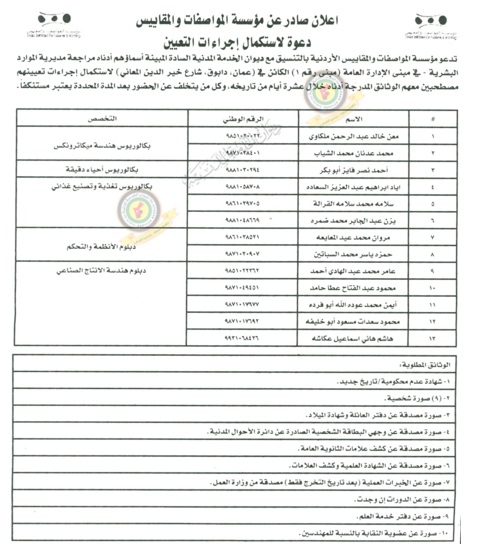 وبحسب ديوان الخدمة، فإن كل من يتخلف عن الحضور يعتبر مستنكفا عن التعيين، داعيا التالية اسماؤهم احضار اثبات للشخصية.
