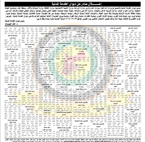 دعا ديوان الخدمة المدنية بالتنسيق مع عدد من الدوائر والوزارات والبلديات التالية أسماؤهم الذين انطبقت عليهم شروط الاعلان المنشور سابقاً التواجد في مبنى ديوان الخدمة المدنية / طبربور- شارع الاقصى حسب المواعيد المحددة في الاعلان .