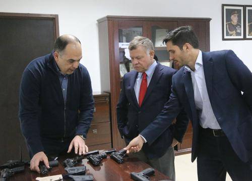 وقام جلالته بجولة على خطوط إنتاج الشركة في منطقة كادبي الصناعية، واستمع إلى إيجاز من مدير عام مركز الملك عبدالله الثاني للتصميم والتطوير العميد المهندس محمد الهباهبة، عن مراحل تصنيع المسدسات والبنادق والحراب الميدانية بجميع أنواعها، كما اطلع جلالته على باكورة إنتاج الشركة من المسدس الأردني وبنادق كادبي.