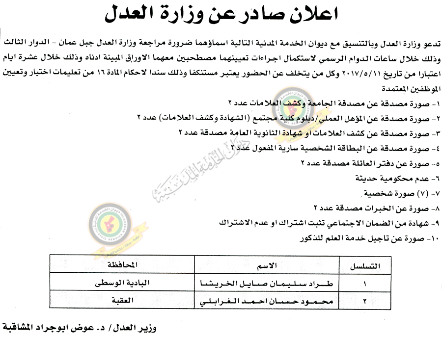 دعا ديوان الخدمة المدنية بالتعاون مع مختلف الوزارات والمؤسسات الحكومية، التالية اسماؤهم لاجراء المقابلات الشخصية لغايات التعيين أو استكمال التعيين.