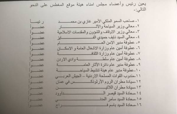 صدرت الإرادة الملكية السامية بتعيين رئيس وأعضاء مجلس أمناء هيئة موقع المغطس برئاسة سمو الامير غازي بن محمد. ويضم المجلس كل من :