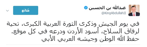 وكتب الملك على صفحته الشخصية على موقع "تويتر": "في يوم الجيش وذكرى الثورة العربية الكبرى، تحية لرفاق السلاح، أسود الأردن ودرعه في كل موقع. حفظ الله الوطن وجيشه العربي الأبي".