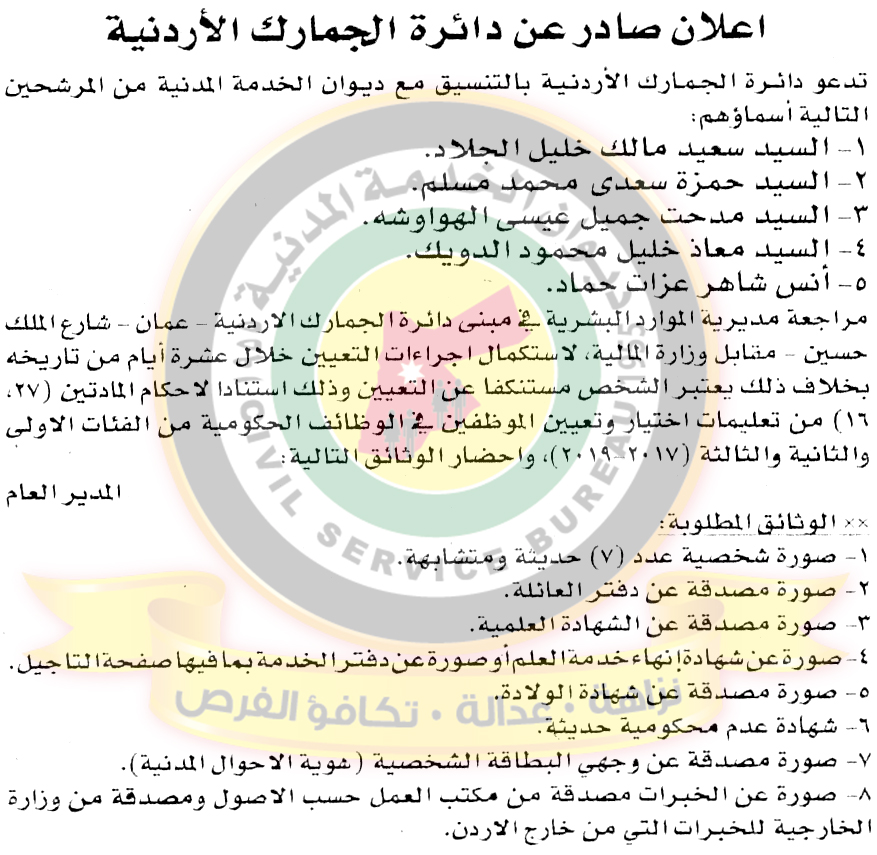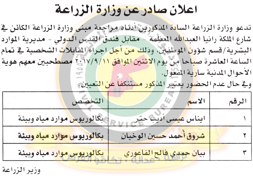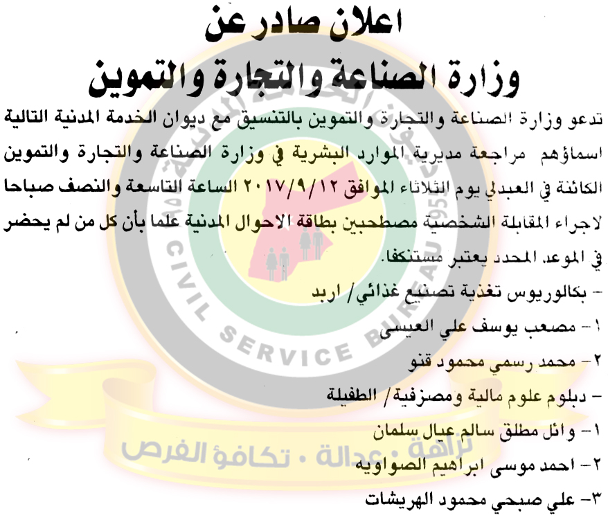 دعا ديوان الخدمة المدنية بالتعاون مع مختلف الوزارات والمؤسسات الحكومية، التالية اسماؤهم لاجراء المقابلات الشخصية لغايات التعيين.