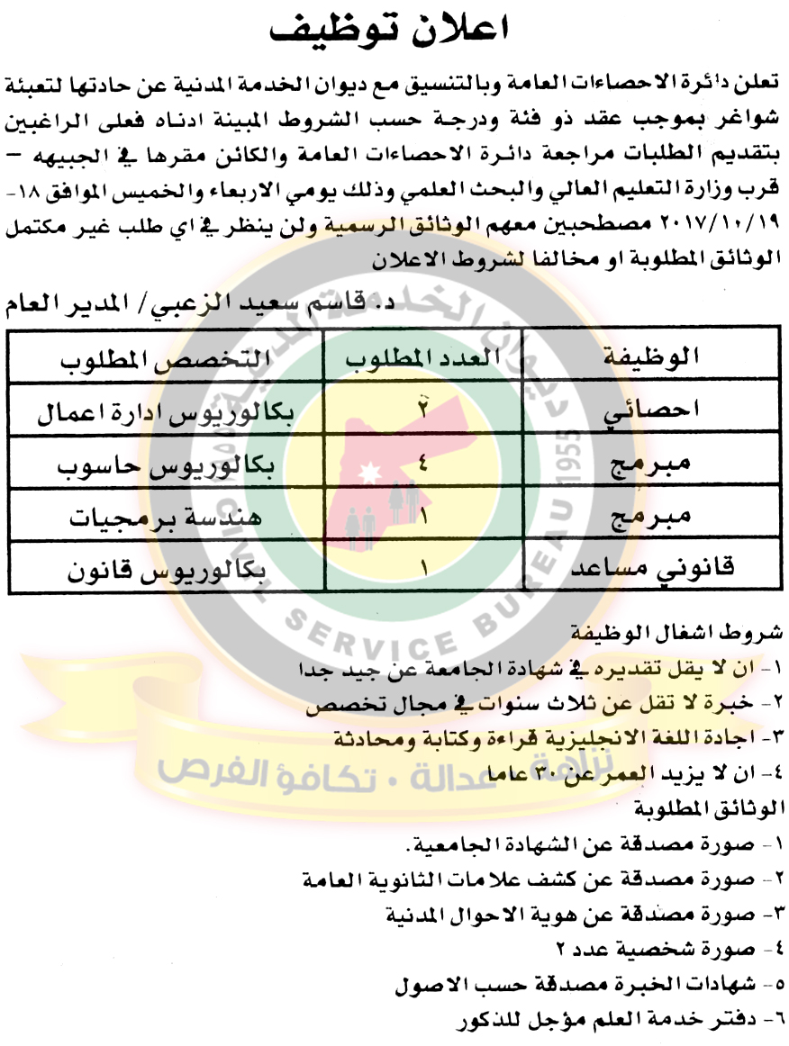 دعا ديوان الخدمة المدنية بالتعاون مع مختلف الوزارات والمؤسسات الحكومية، لتعبئة الشواغر، وإجراء المقابلات الشخصية لغايات التعيين.