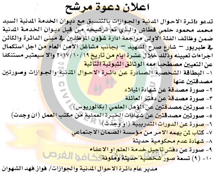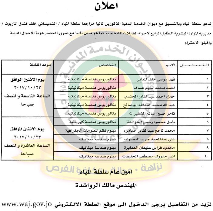 دعا ديوان الخدمة المدنية بالتعاون مع مختلف الوزارات والمؤسسات الحكومية، التالية اسماؤهم لاجراء المقابلات الشخصية لغايات التعيين.