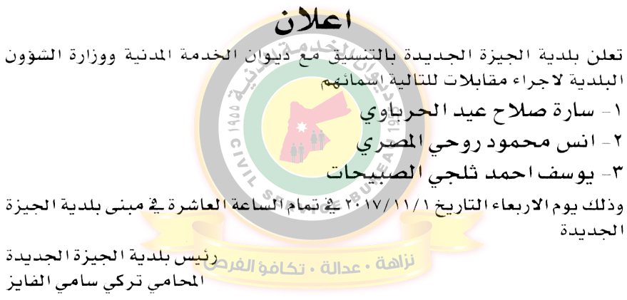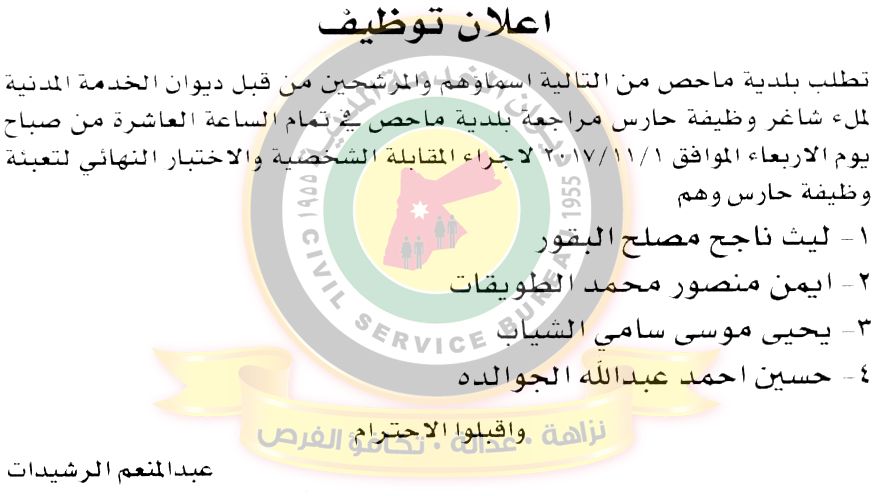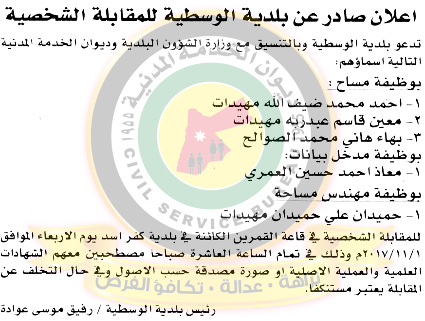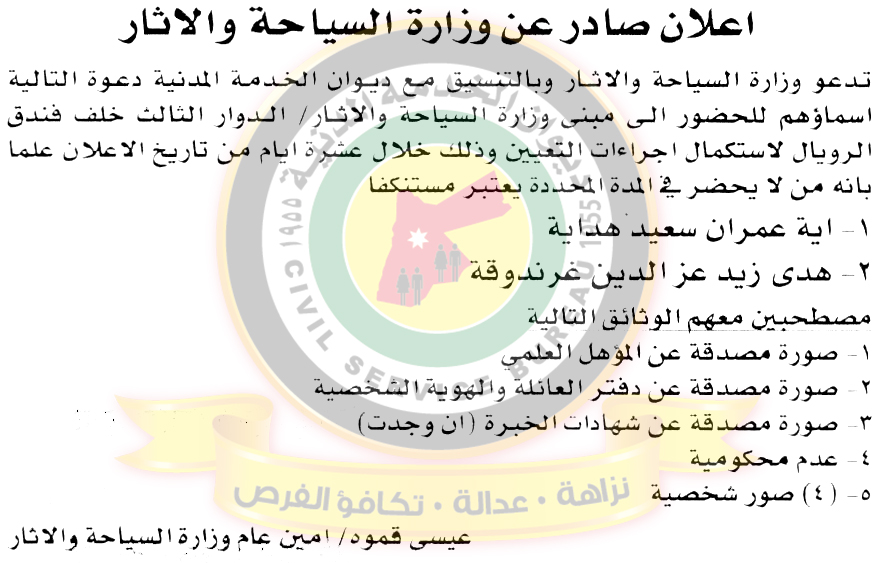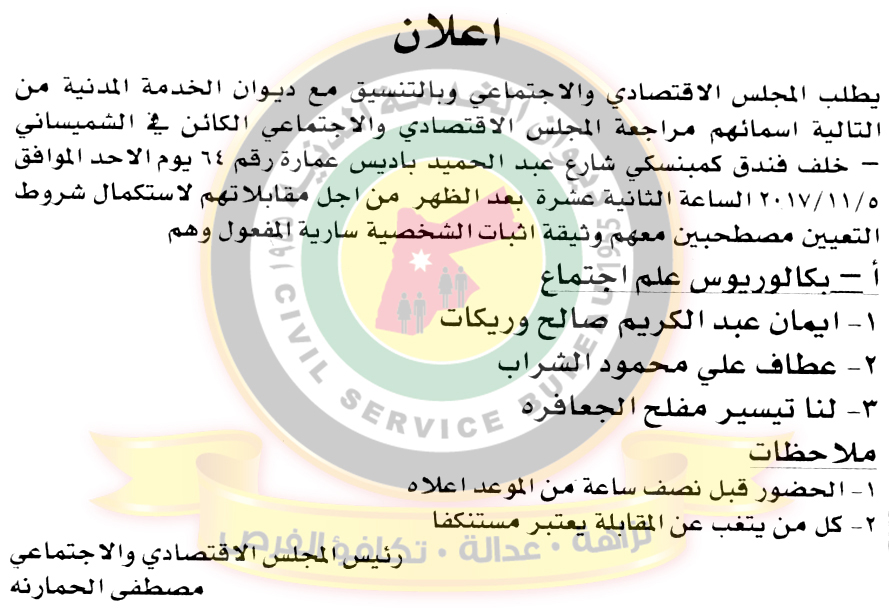 دعا ديوان الخدمة المدنية بالتعاون مع مختلف الوزارات والمؤسسات الحكومية، التالية اسماؤهم لاجراء المقابلات الشخصية لغايات التعيين.