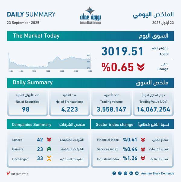 14.1 مليون دينار حجم التداول في بورصة عمان2025-09-23